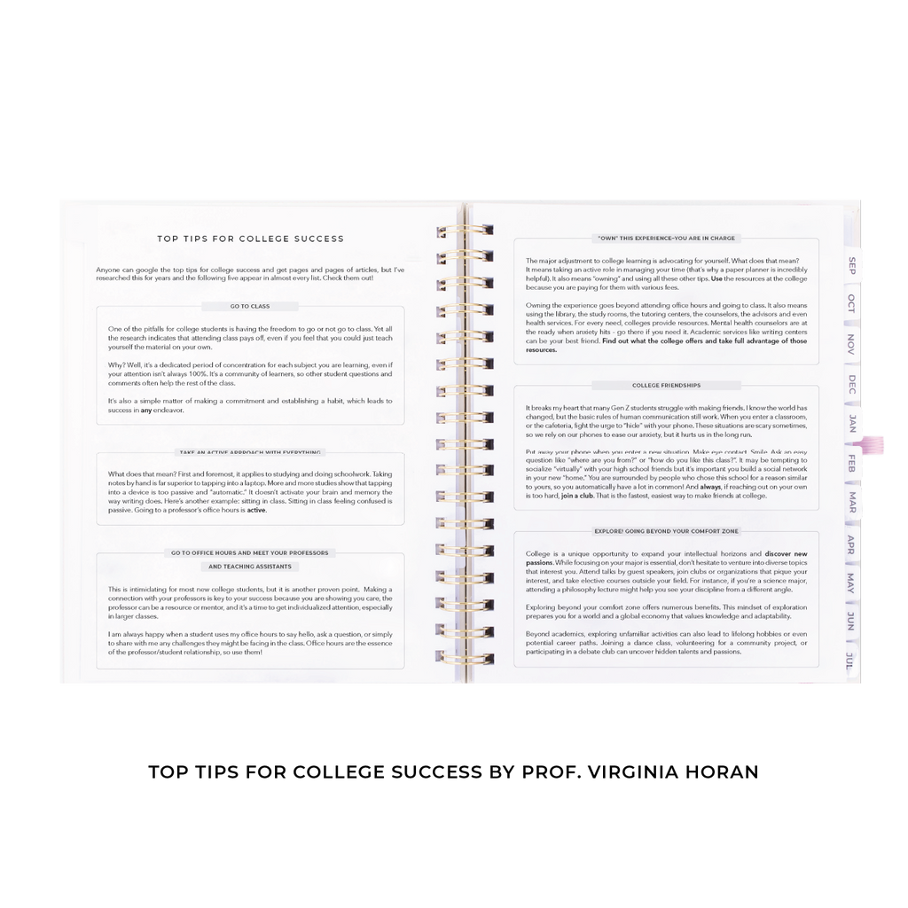 Every planner comes with access to a digital library of weekly college success tips created to help you thrive! From prepping to finals to battling burnout to addressing procrastination, learn how to navigate the ins and outs of college life.